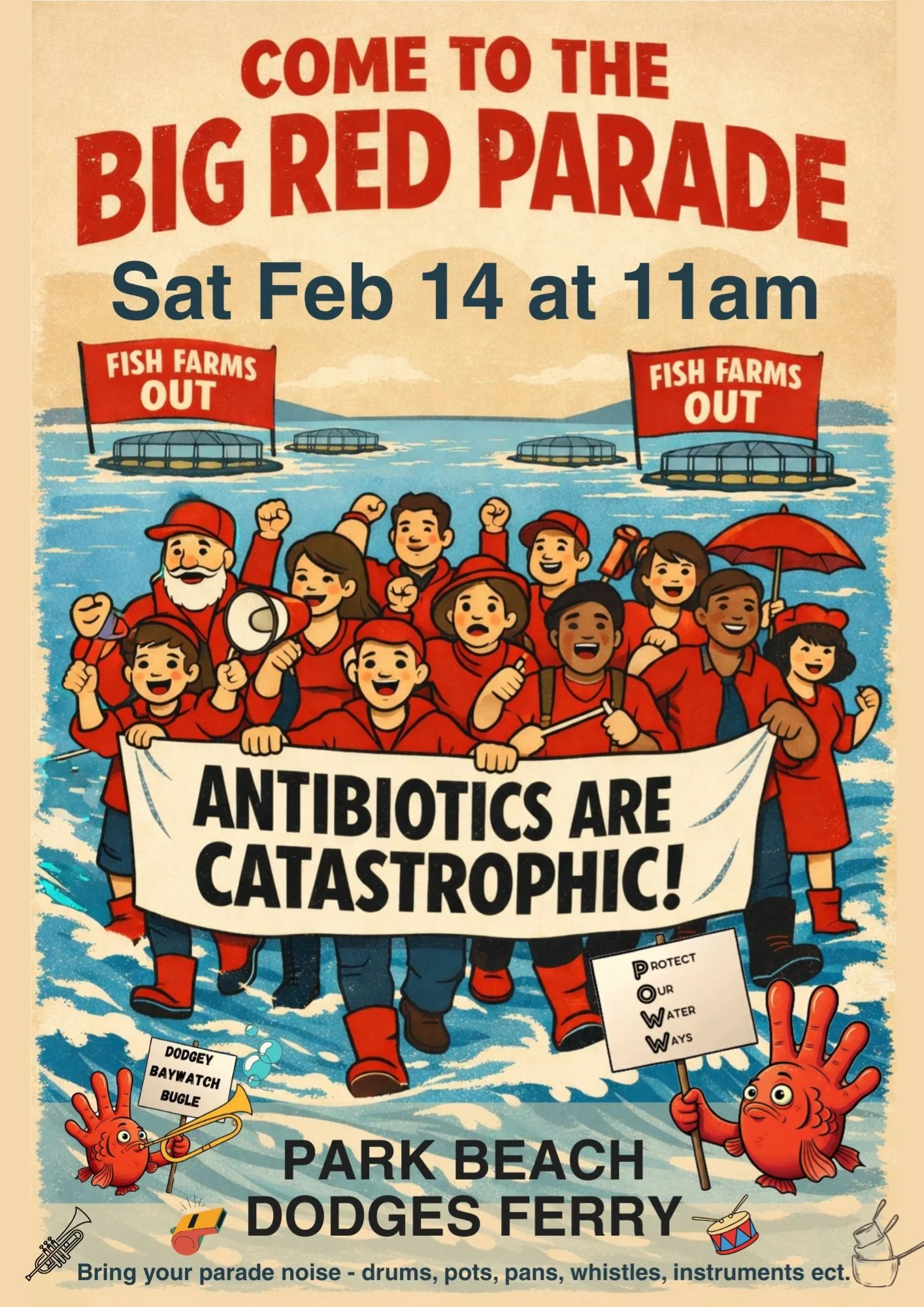 on Saturday February 14 at 11am, we will come together as a community for a Big Red Parade - a visible, peaceful, and fun action to protect our bays from the polluting impacts of industrial fish farming in Tasmania.